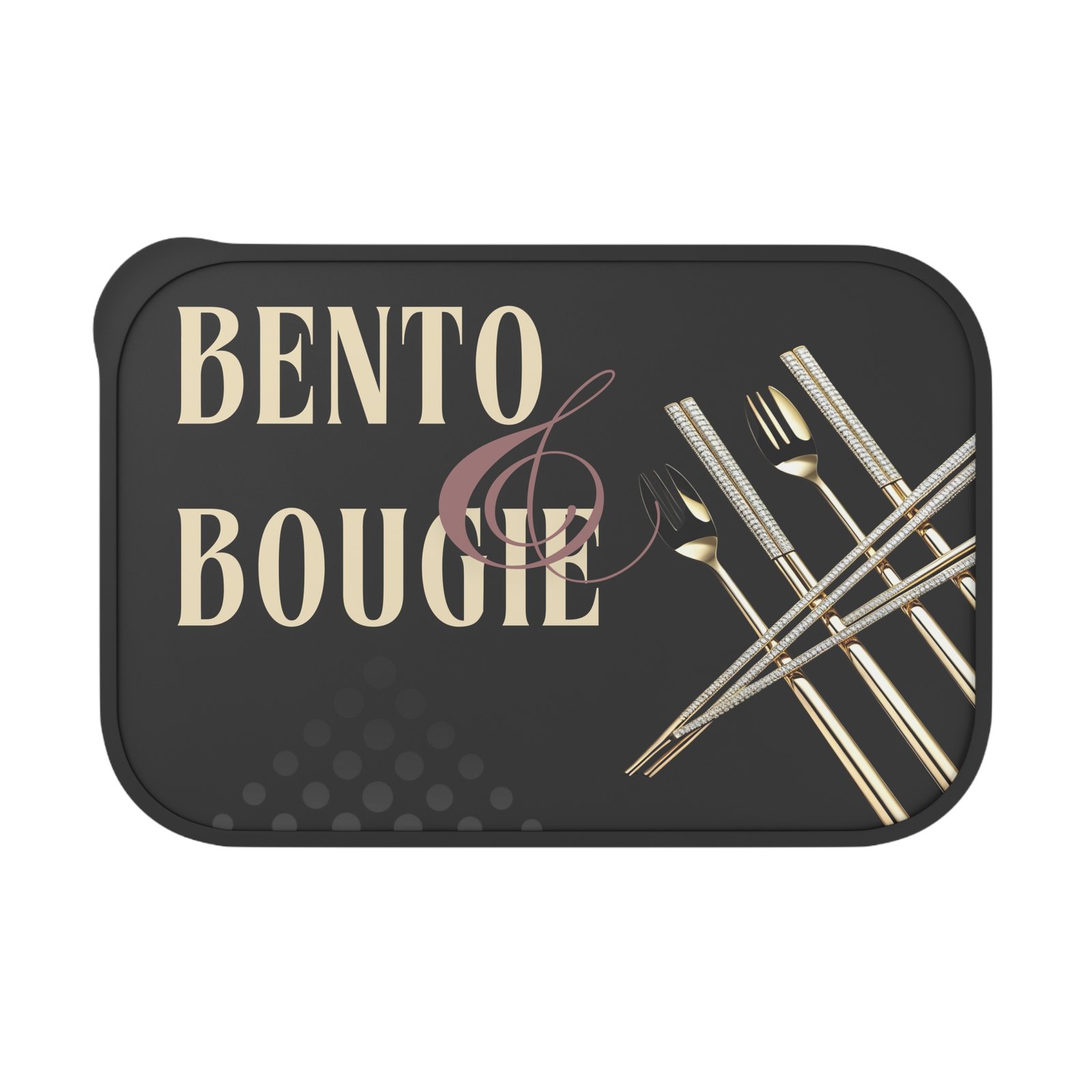 A stylish black bougie lunch box made from eco-friendly 100% black PLA bioplastic, featuring a vibrant print on the lid. Perfect for those who want to store their food in style and enjoy a chic design while on the go. Ideal for individuals who care about the environment and enjoy their meals in a trendy container. Relevant for daily lunches, picnics, and eco-conscious consumers.