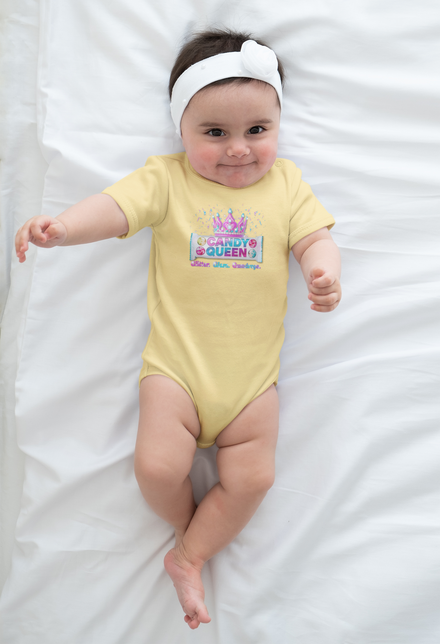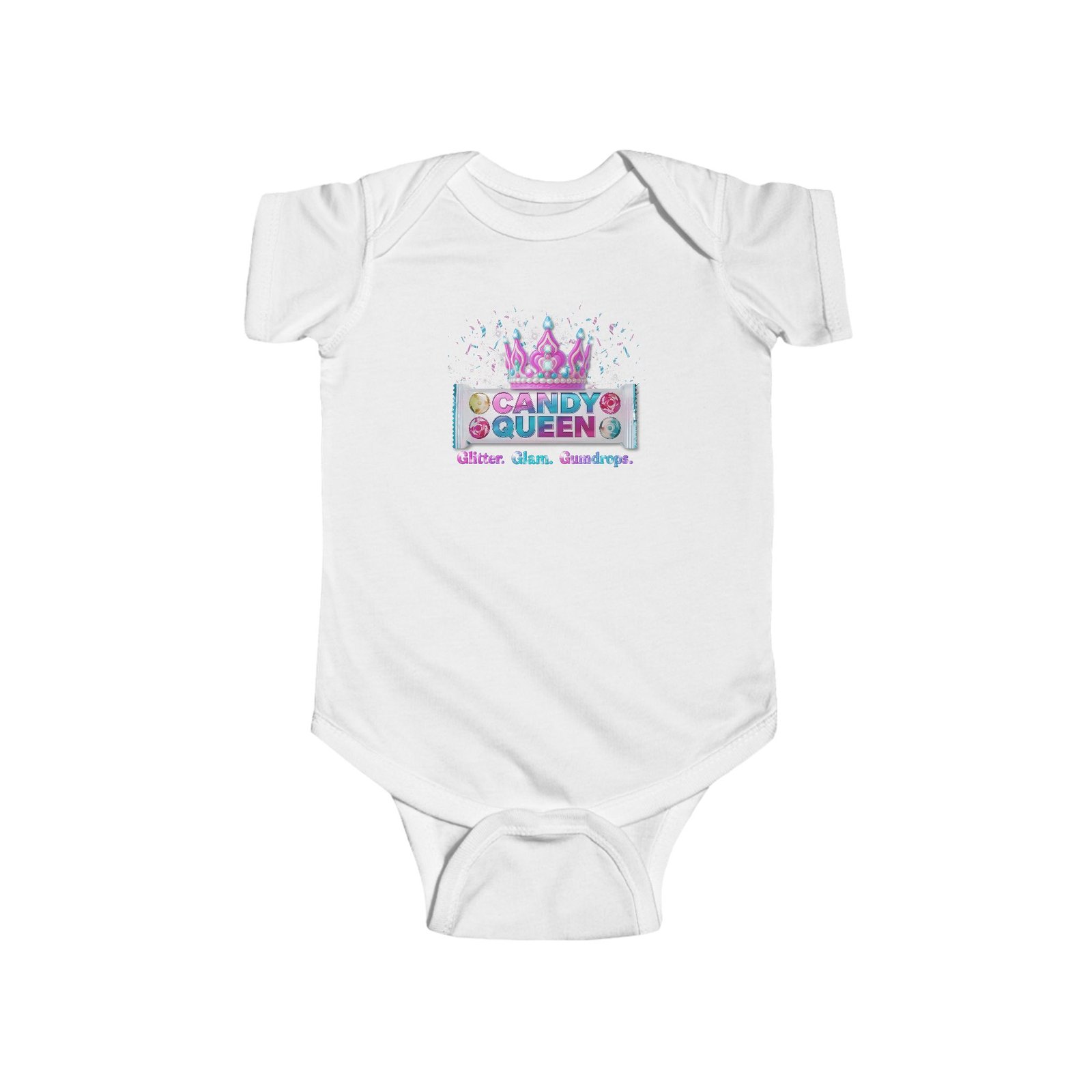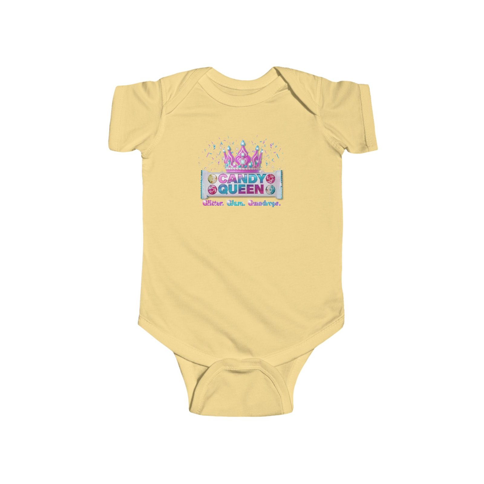 Start them young! The Candy Queen Baby Tee/Bodysuit is the sweetest way to bring your little one into the Candy Bar Family collection. With a playful candy-wrapper design and bold “CANDY QUEEN” graphic, this shirt is perfect for mini royalty.