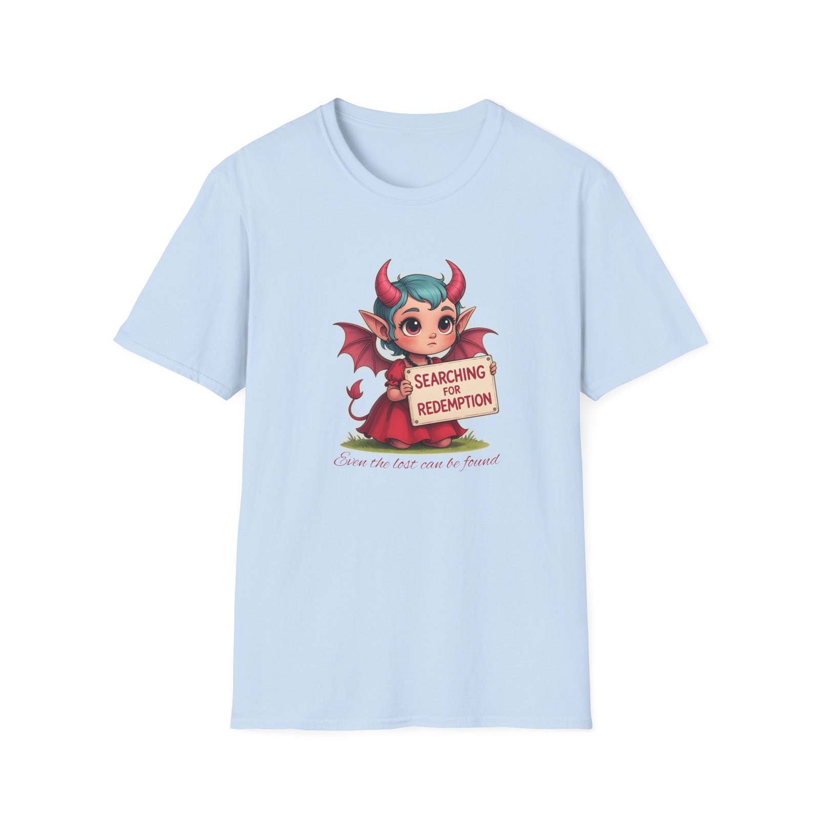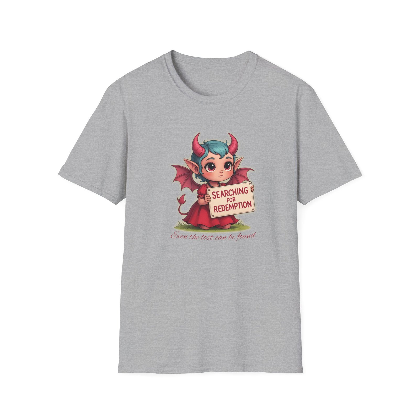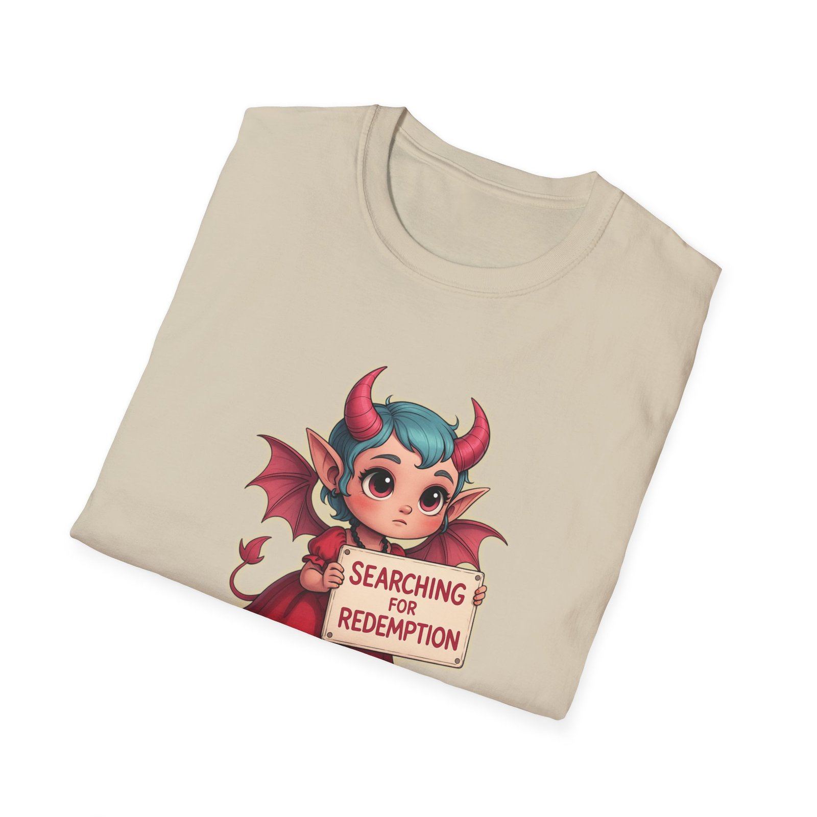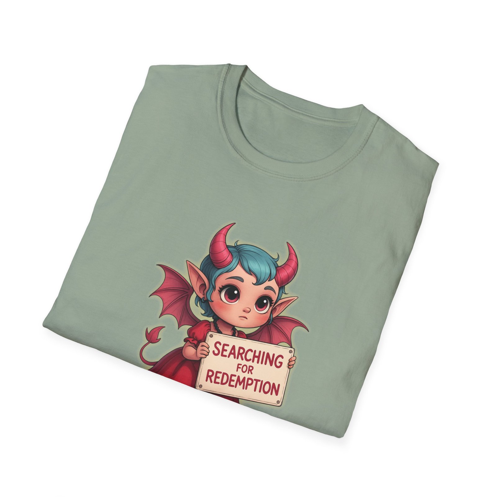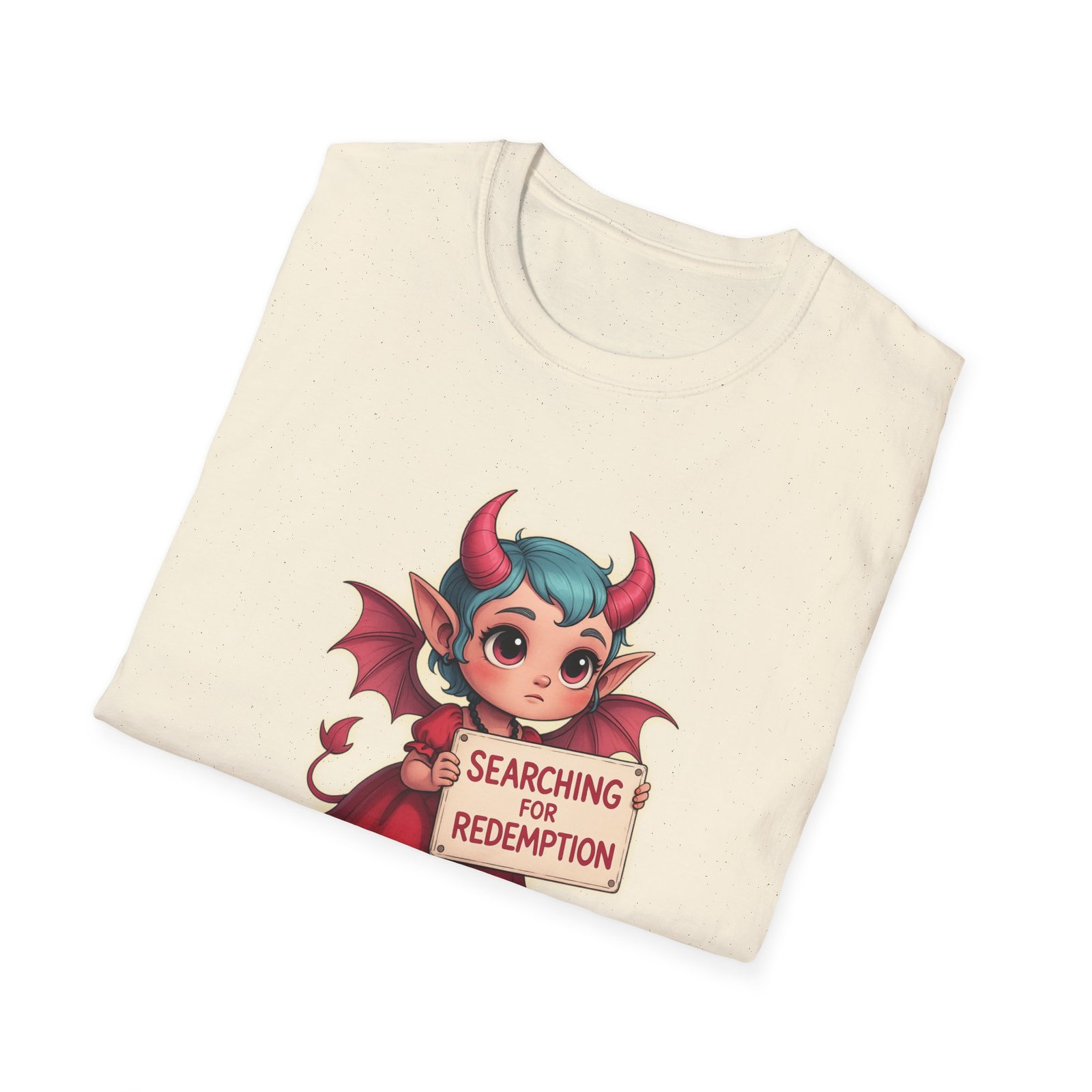 A unique t-shirt featuring a design of a little girl devil on her knees as if she’s praying while holding up a sign that says searching for redemption. This t-shirt gives off a rebellious yet introspective vibe, perfect for those who appreciate edgy and thought-provoking designs. Suitable for adults and great for casual wear.