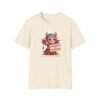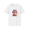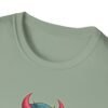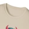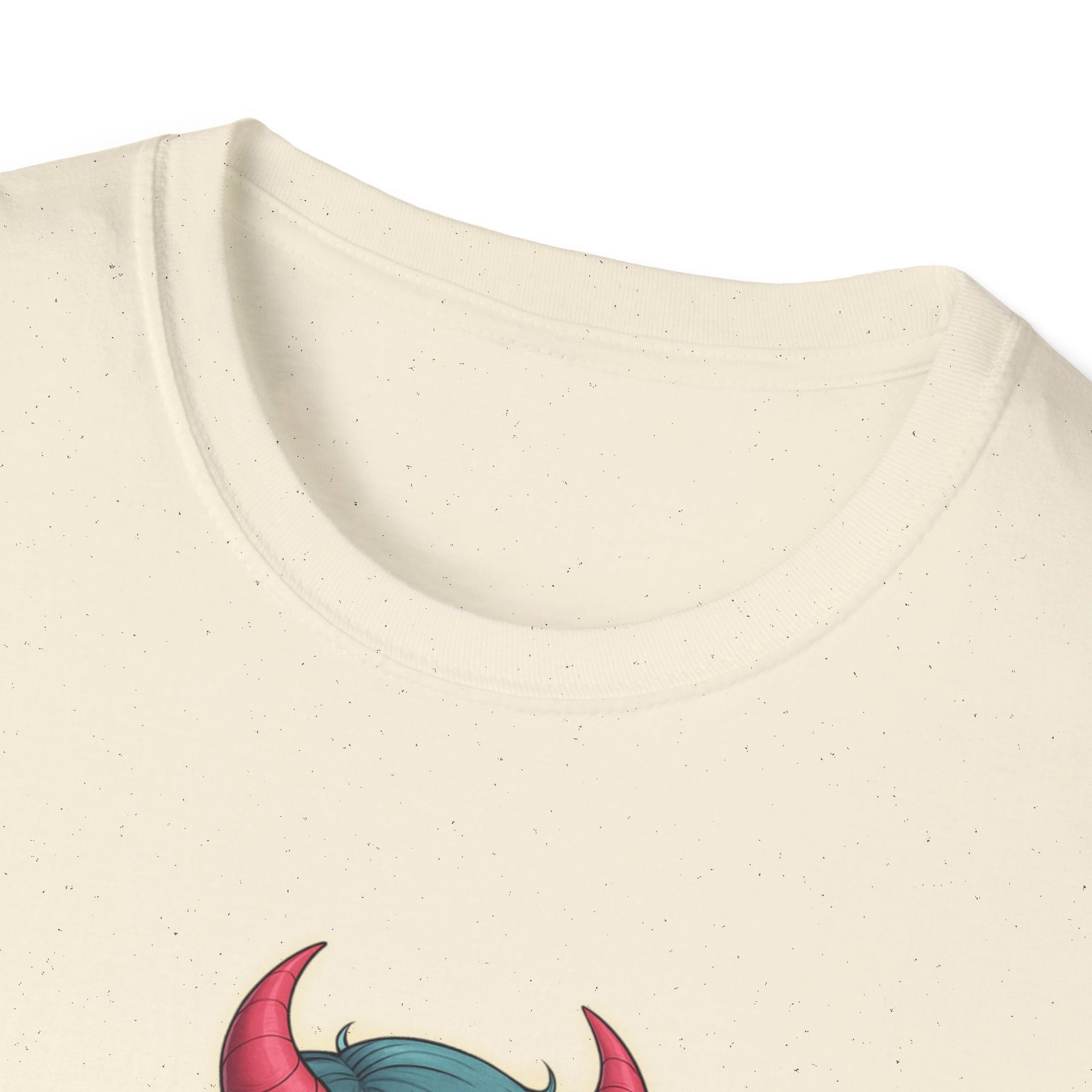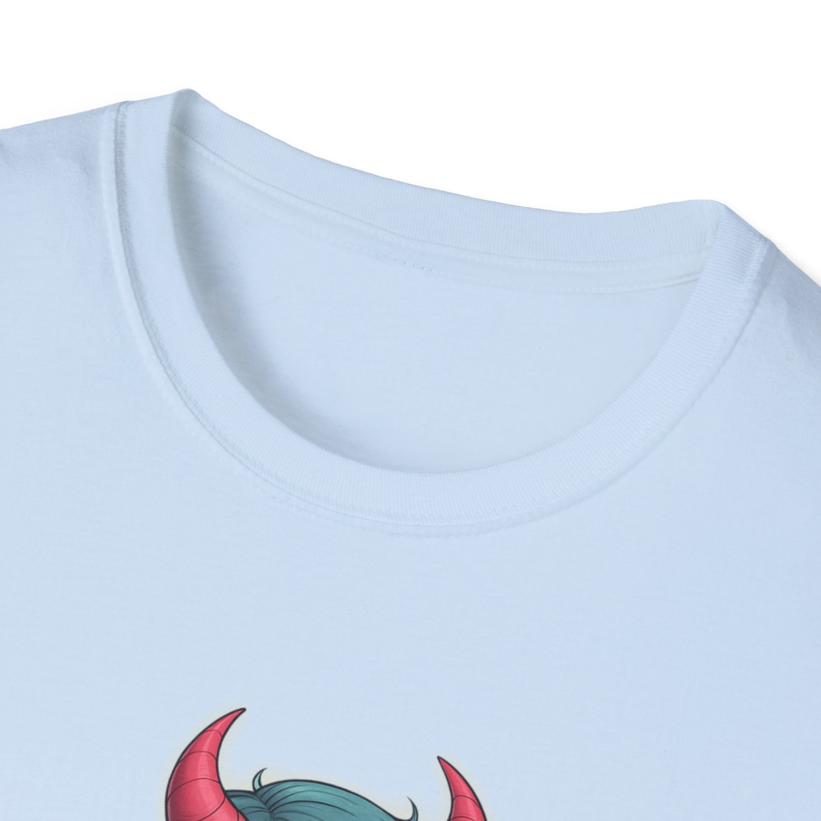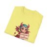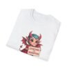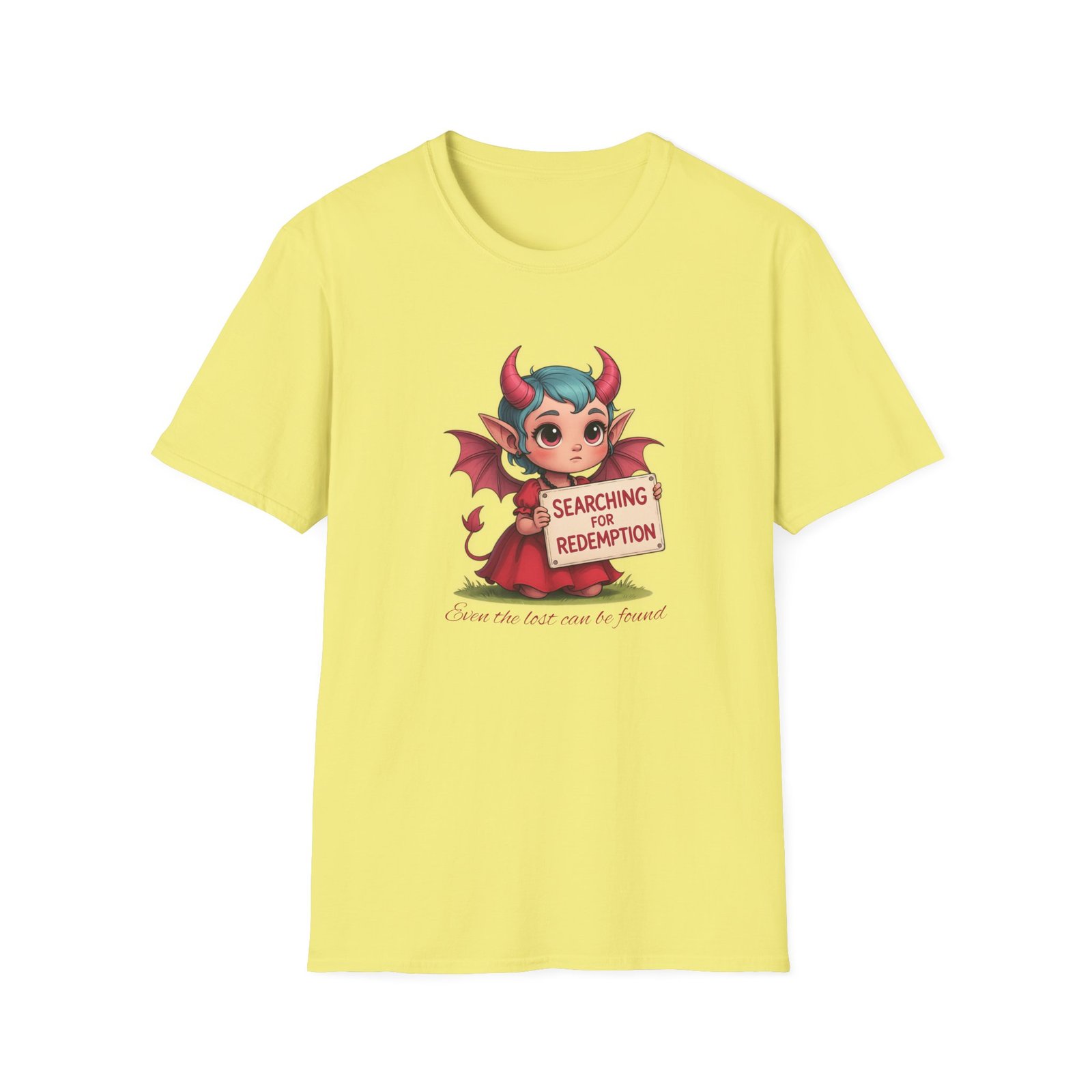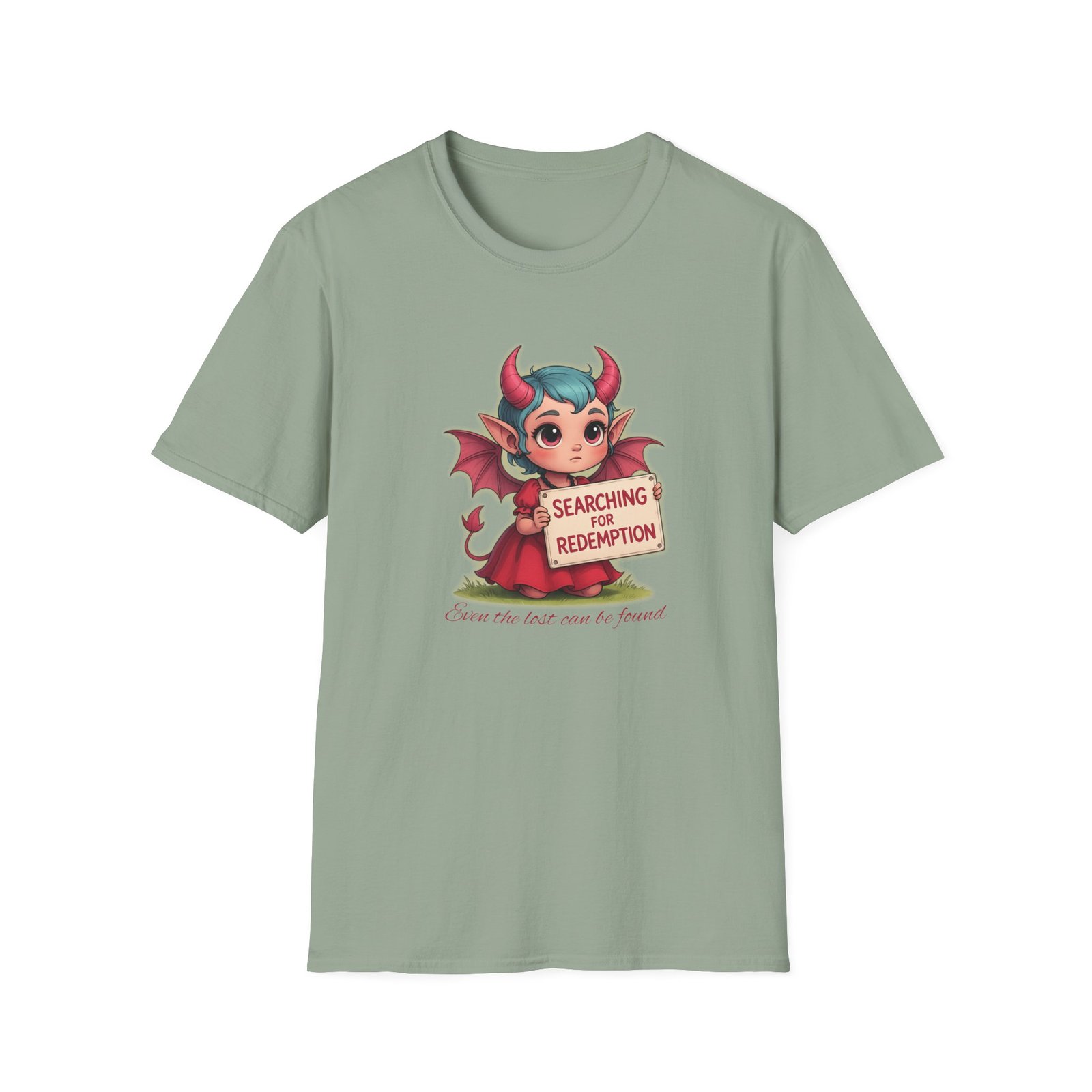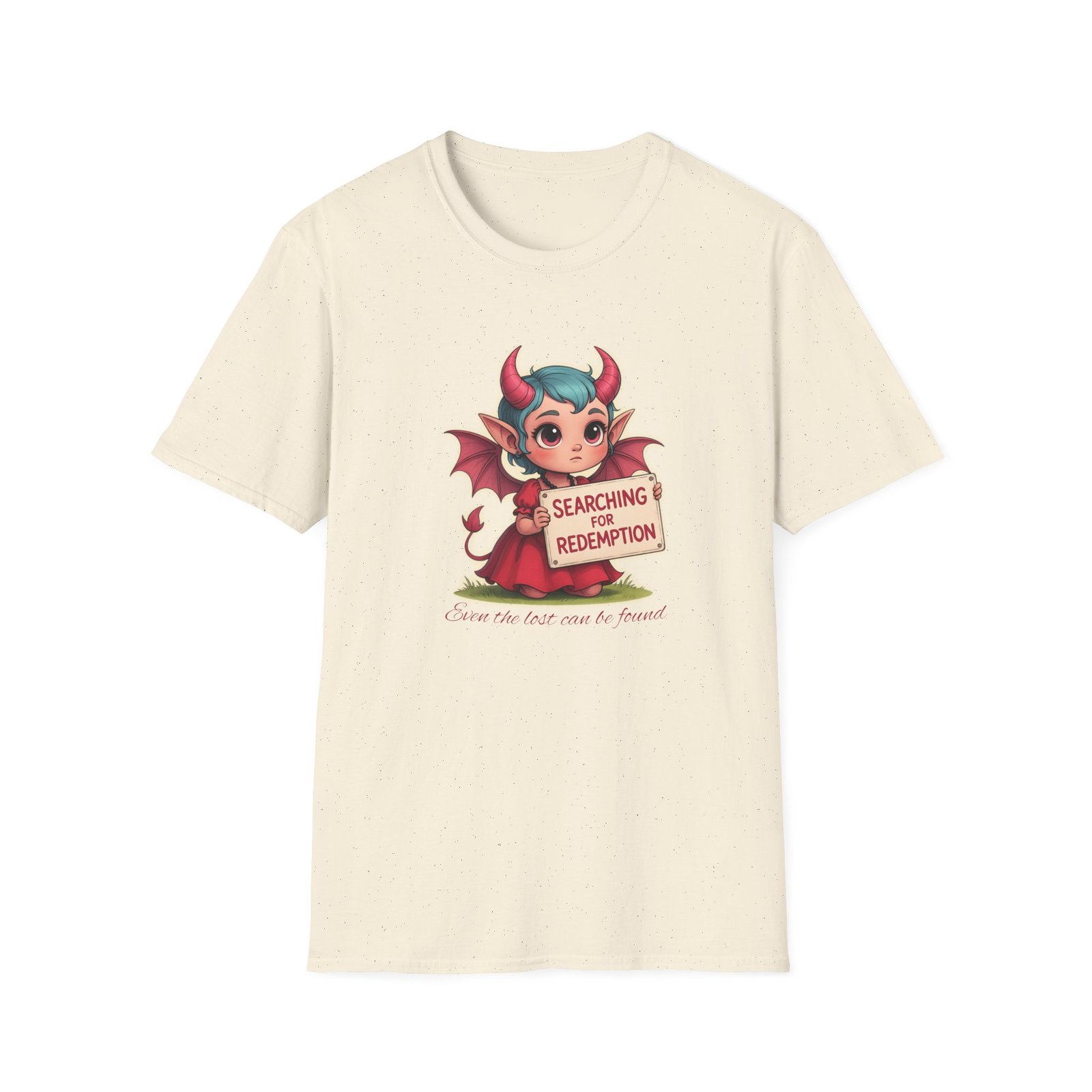 A unique t-shirt featuring a design of a little girl devil on her knees as if she’s praying while holding up a sign that says searching for redemption. This t-shirt gives off a rebellious yet introspective vibe, perfect for those who appreciate edgy and thought-provoking designs. Suitable for adults and great for casual wear.