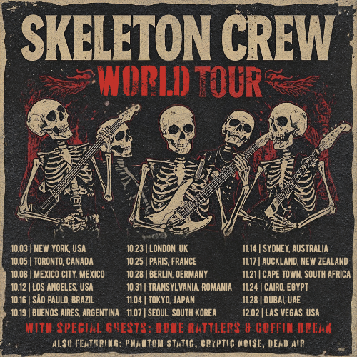 Vintage Concert Poster Design – Skeleton band with guitars, drums, and tour dates across the globe.