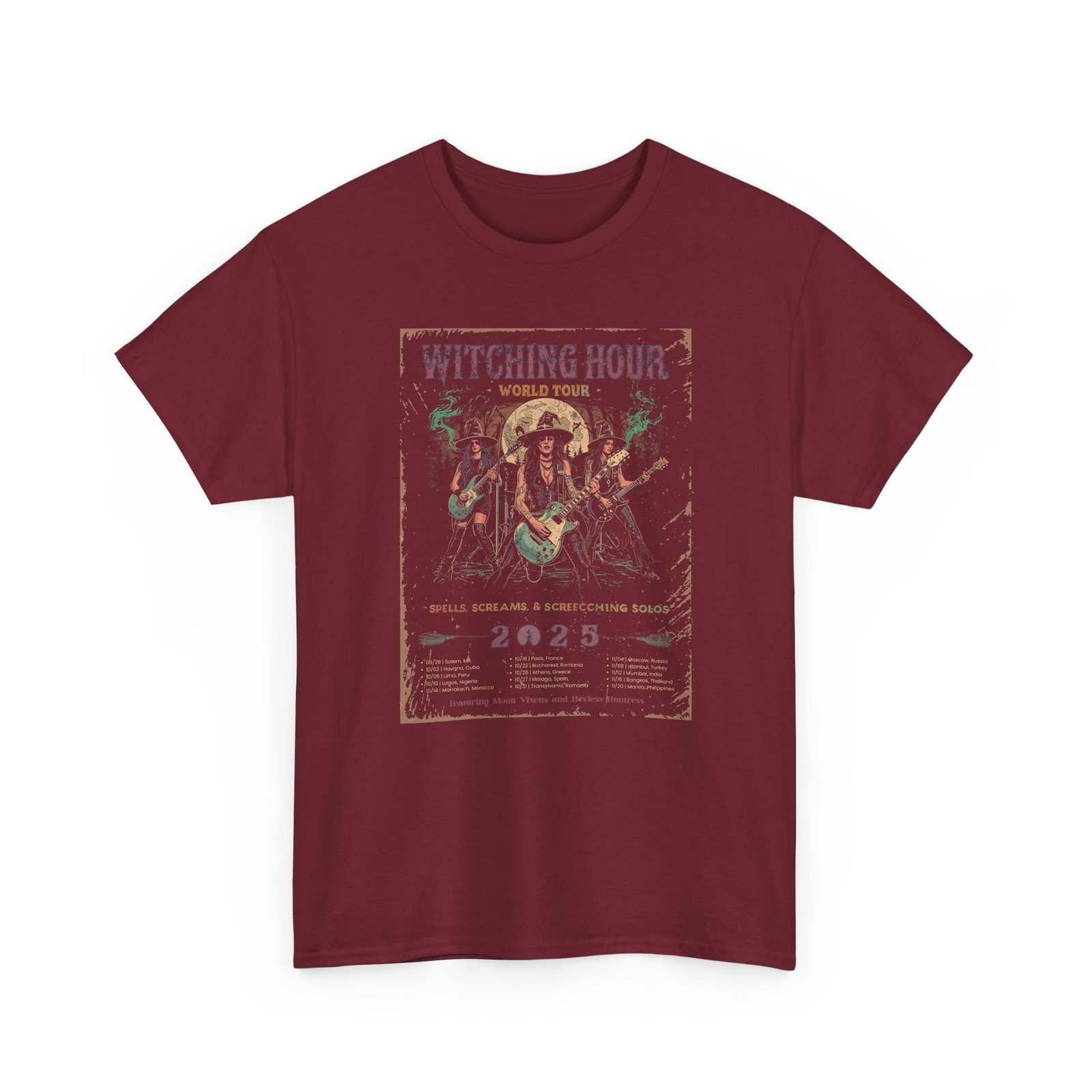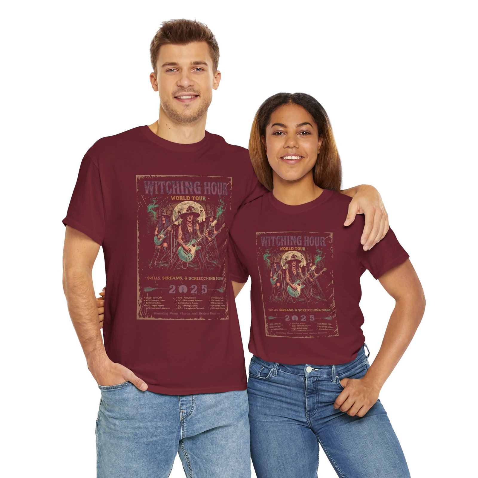 Step into the Witching Hour World Tour 2025 with this vintage-inspired graphic tee! Featuring witchy rockers shredding under the full moon, this shirt combines dark vibes, retro concert poster style, and bold colors perfect for Halloween or everyday gothic fashion.